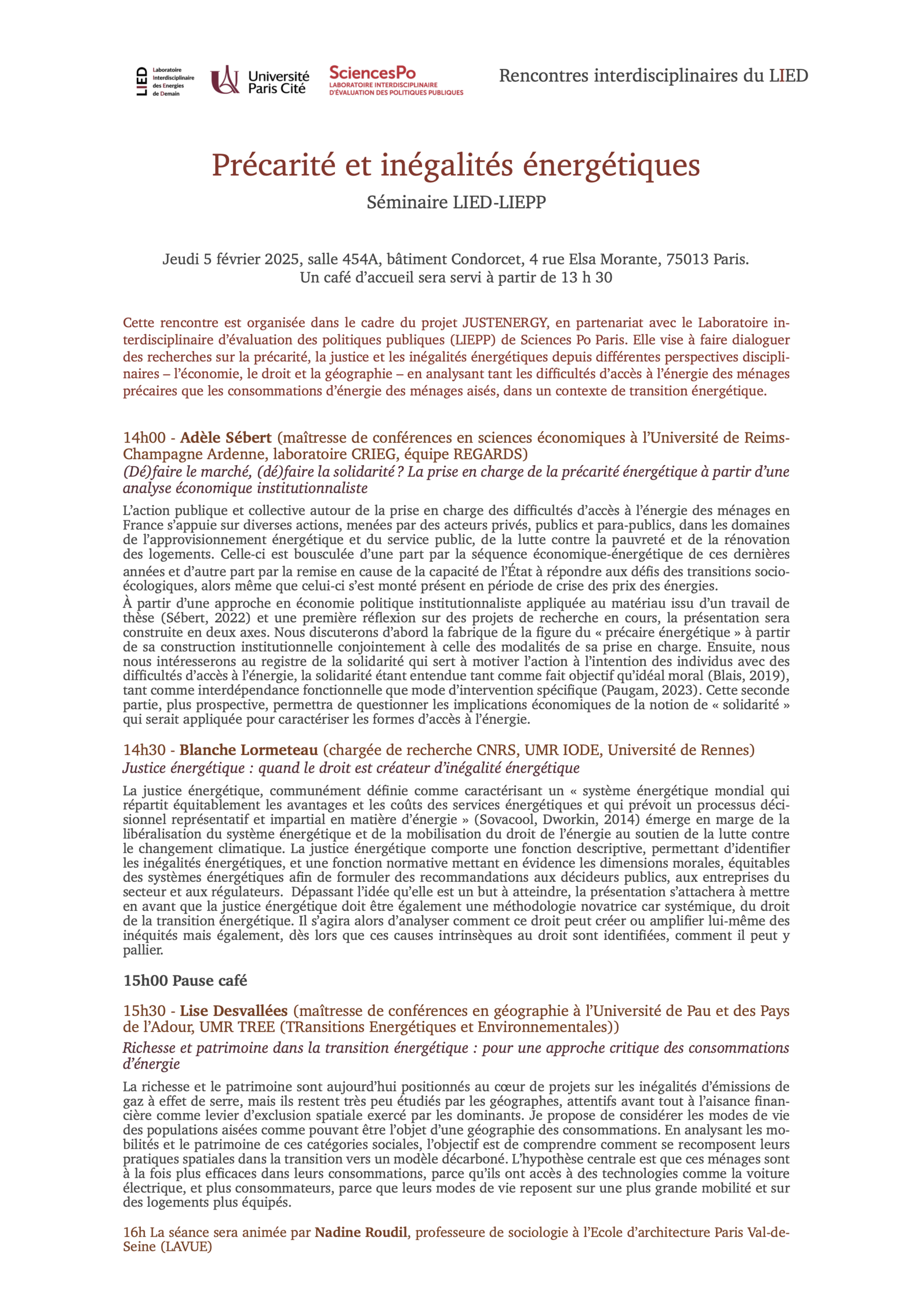 Cette rencontre est organisée dans le cadre du projet JUSTENERGY, en partenariat avec le Laboratoire Interdisciplinaire d’Evaluation des Politiques Publiques (LIEPP). Elle fera intervenir:
